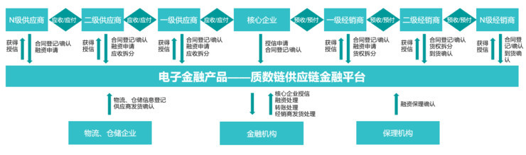供应链金融链的特点是在我们设计的业务范围内,必须有一个中心化的或者准中心化的核心企业,这个核心企业可以给下游供应商、上游经销商授信,而这个授信的过程是逐级授信的。银行的票据管理已经做到了票据授信,但只能到一级供应商或一级分销商,很难到中小微企业。