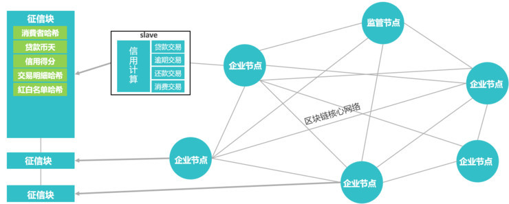 而监管节点的功能和作用在哪里?这就体现在小贷监管上,要求我们在构建链的同时,还要对节点赋予不同的角色、业务和服务支持。所以只有交易的节点是不够的,小贷监管产品中更重要的是监管节点的使用:监管节点如何自动发现交易中出现异常现象,由监管节点的智能合约自动检索、自动匹配,然后提醒政府和相应主管单位,这显然是很典型的在监管领域用的监管链。