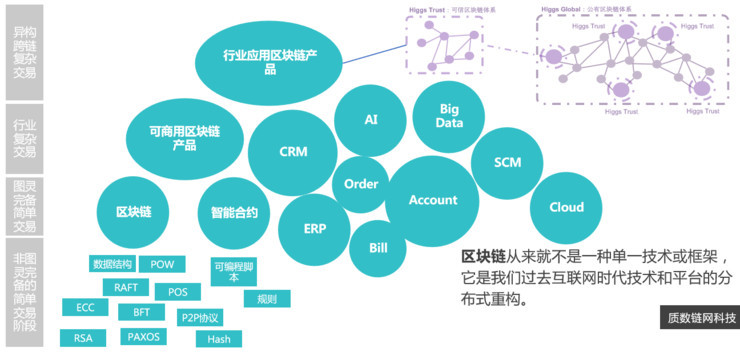 事实上,区块链从产生之际就并不是单一的技术平台或者框架,它其实是多样技术的组合,它创造了一种生态,更像是互联网阶段,所以更多人看到区块链会联想到90年代互联网1.0的爆发,因为它不是简单技术,而是多技术组合,包括博弈论、人文等相关情节的加入,区块链技术是行业知识、行业领域模型、现有技术积累和现有实践的组合体,要构成可商用区块链,一定要构建在一个既能满足广泛节点的Global网络,也要满足现有国家行业及监管制度下的联盟链或Trust可信任机制。